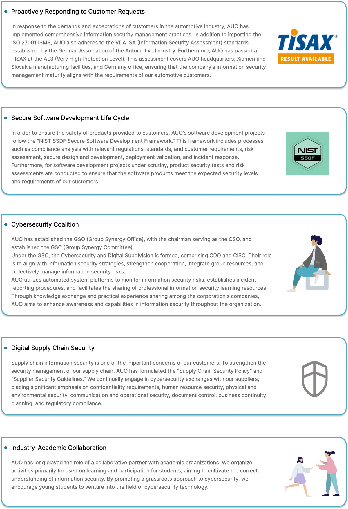 AUO places high importance on the security of employees and partners' information assets. Through our Information Security Management organization, it promotes and implements information security management to protect AUO's intellectual property, customer data, and enhance employees awareness of information security. We continuously improve our risk management mechanisms and enhance protective measures to strengthen our information security.